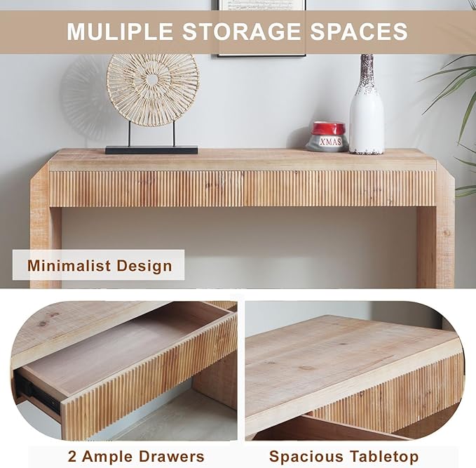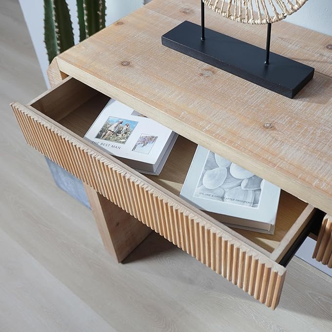 - Wood Console Table with Drawer: Our rustic wooden console table will enhance your home with the timeless charm. Featuring a sleek, natural finish and a ribbed textured drawer front, it is the perfect addition to modern, rustic, or minimalist interiors