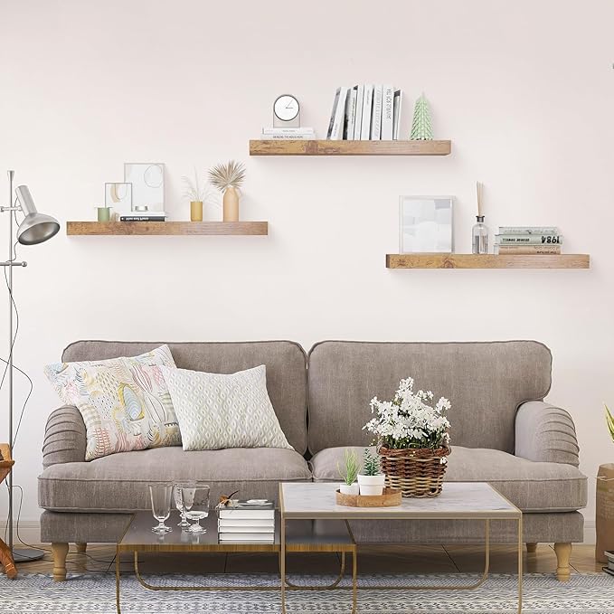 - Free Placement: This simple floating wall mounted shelf set comes are equipped with hardware required for installation, reducing the trouble during the installation process. The floating shelves has 50lbs high Weighing capacity for installation on wood studs, drywall, solid concrete, or brick. Perfect for renters and homeowners alike.
