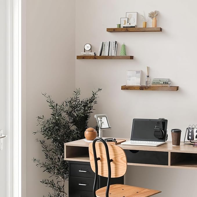 Floating Shelves for Wall Set of 3, 24in Hanging Shelf for Books, Storage, Room Decor, Rustic Wood Wall Mounted Shelves for Bathroom, Toilet, Bedroom, Living Room, Kitchen, Office, Rustic Brown