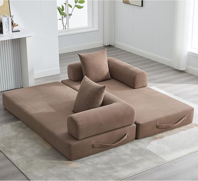 Convertible Folding Mattress Couch, Comfy Corduroy Sleeper Floor Sofa Bed with Fixed-Shape Frame, Floor Sofa with Armrest, Lounge Couch for Living Room Bedroom Lounge Studio,Brown
