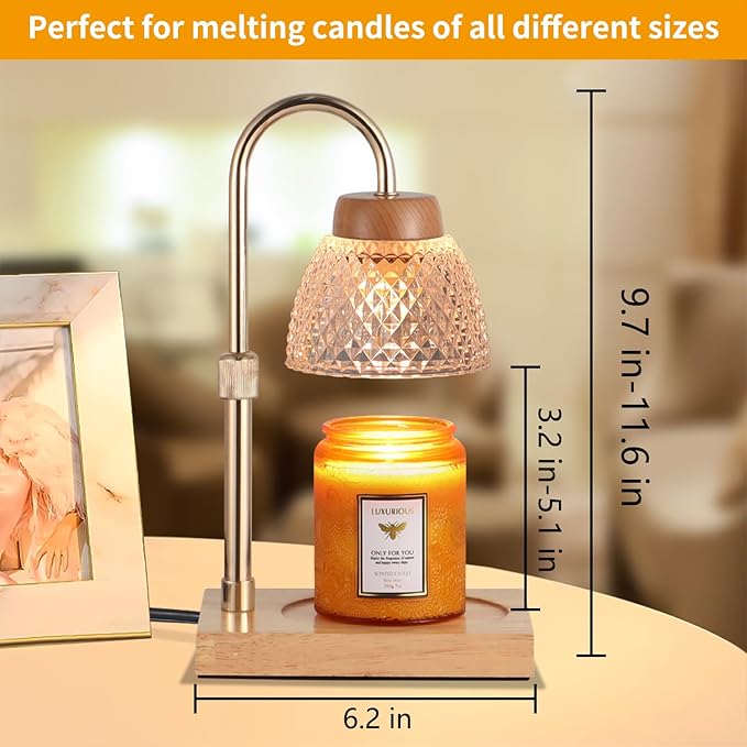- 【Adjustable Height Fit All Candle Size】The distance from the base of this candle warming lamp to the lampshade is 4.7 inches(6.7 inches after adjusting height), compatible with Yankee Candles and most different types of jar candles or wax. Under the wooden base, anti-slip pads are added to ensure stability, making you feel safer when using this candle warmer lamp for jar candles. Say goodbye to candle flames and keep your house safe from fire hazards with the Candle Warmer Lamp.