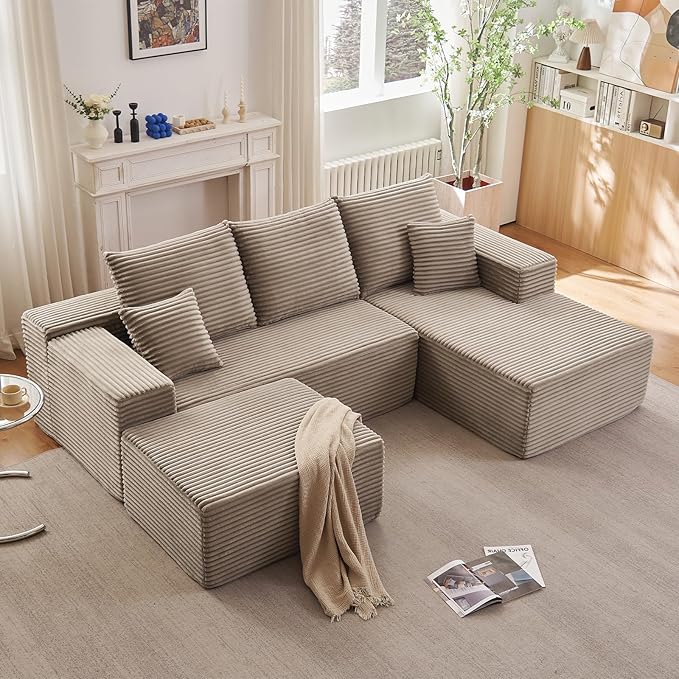107" U-Shape Cloud Couch, Modern Modular Sectional Comfy L-Shape Sofa with Ottoman, Deep Seat, Upholstered Corduroy Sleeper Chaise Longue for Living Room Bedroom, No Assembly Required, Camel