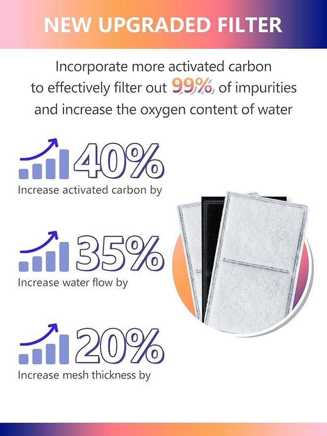 - Advanced Filtration: Pet fountain filter replacement are saturated with premium coconut shell activated carbon and non-woven fabric. They effectively isolate cat hair & food debris, remove impurities, particles & odors, and soften tap water. Keeps water clean, fresh 24/7, boosting pet hydration