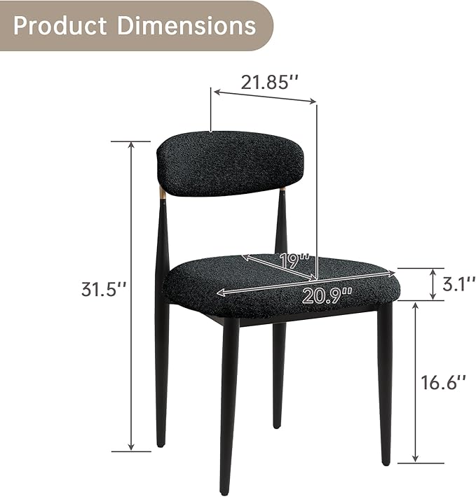 - Built to last: The chairs boast a sturdy struction. The high-quality boucle over cushions and durable metal frame ensures years of reliable use, showcasing exquisite craftsmanship. Our chairs can effortlessly support up to 300 pounds. Product Dimensions: 20.9''D* 21.85''W* 31.5''H