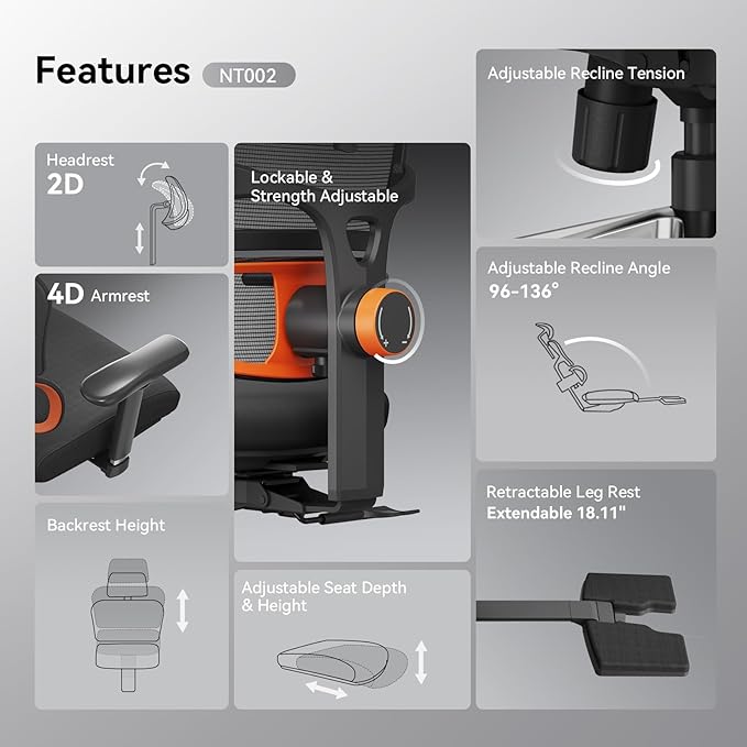 - 【136° Reclining Swivel Chair】The NEWTRAL computer chair has a backrest that tilts and locks between 96° and 136°. The bottom knob adjusts the tension for rocking mode. With 360-degree rotation and sturdy, silent swivel casters, it ensures smooth movement. Suitable for users between 160 cm and 190 cm tall.