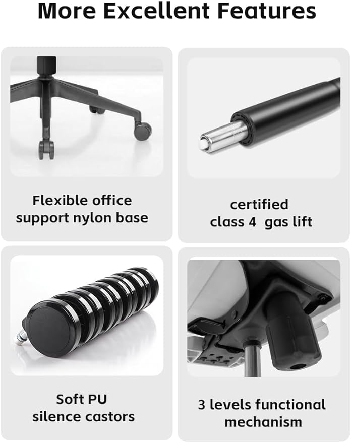 - Adjustable Features: Easily customize your seating with height adjustment and a tilt mechanism for better posture and comfort. Smooth-rolling casters and a 360° swivel base provide effortless movement and flexibility in your workspace.