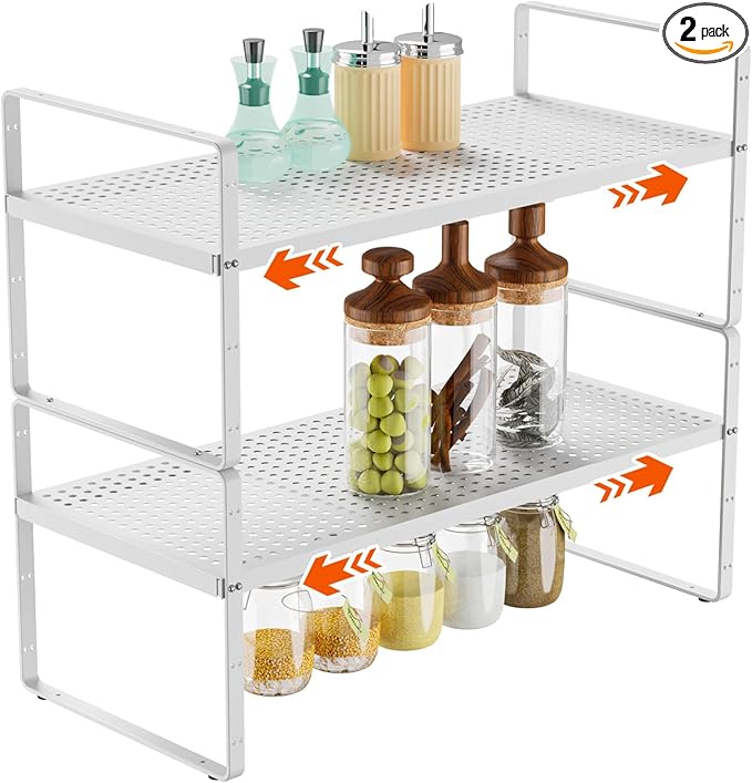 2Pack 16.5-27’’L Expandable Stackable Cabinet Shelves, Adjustable Spice Rack Cabinet Shelf Organizer for Kitchen, Countertop, Pantry and Cupboard, White