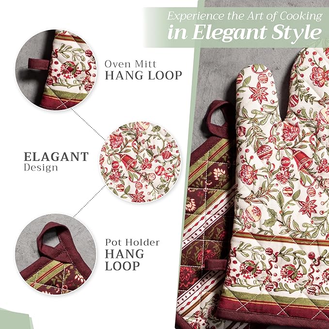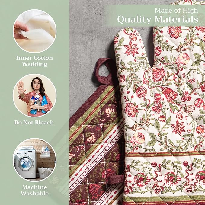 - Premium Quality: Crafted from quilted 100% cotton, this heat-resistant oven mitt and pot holder set protects your hands from hot cookware. Each piece features a built-in hanging loop for easy storage and quick access. This versatile set is perfect for everyday home kitchens, farmhouse kitchens, hotels, restaurants, and bakeries