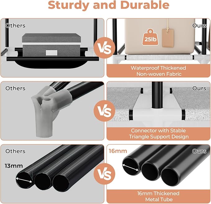 - [Sturdy and Durable Construction] Closet storage organizer is made of thickened metal tube, waterproof non-woven cover and reinforced PP plastic connectors. Provides superb weight capacity, sturdy, and durable. Meet your long-term storage needs.