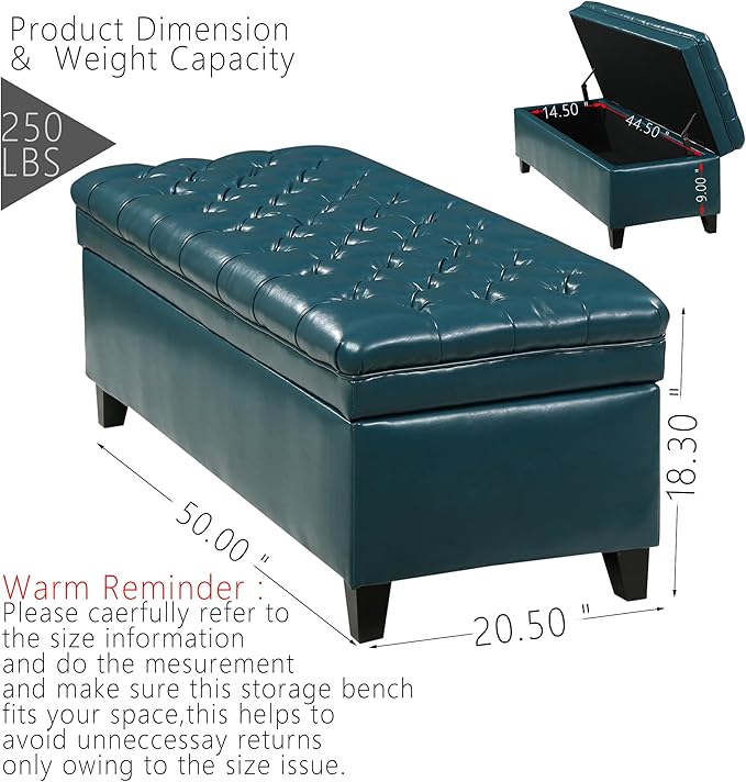 - Easy Assembly : It is easy as a breeze to assemble this tufted PU leather teal blue ottoman with storage for living room,you only need to add the legs to the bottom of the storage bench.