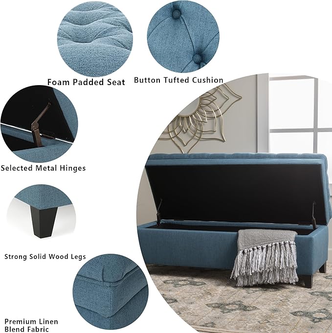 - Comfy Materials : Looking classic and modern,these end of bed storage benches for bedroom is upholstered with quality linen fabric,which is elegant in appearance,comfy on the touch and very wear resistant. And also this tufted blue ottoman for living room is padded with thick high density foam to give you more comfortable sitting experience.