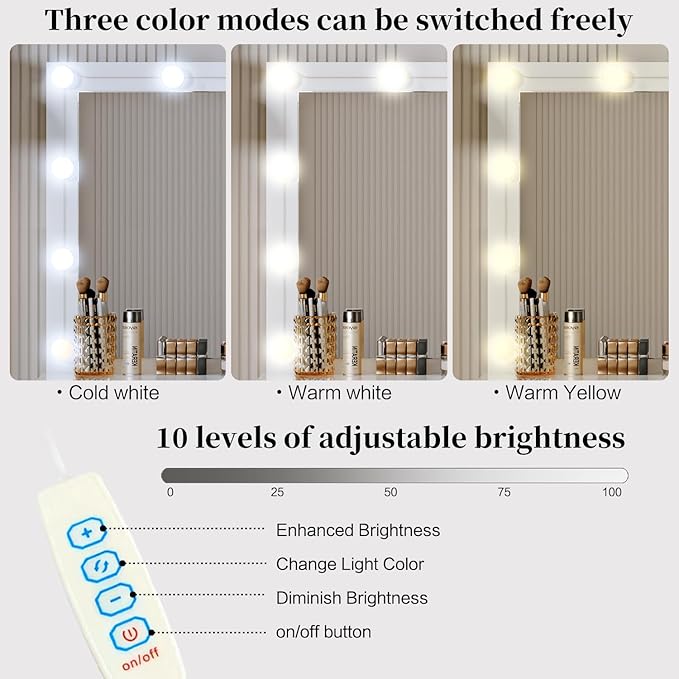 - 12 Hollywood Bulbs + 41.73" Pro-Grade Oversized Mirror: Step into your personal glam studio with our vanity with lights! Our vanity with mirror and lights features 12 Hollywood bulbs with 3 color tones, paired with a 41.73" professional-grade large mirror for flawless makeup application—all controlled at your fingertips