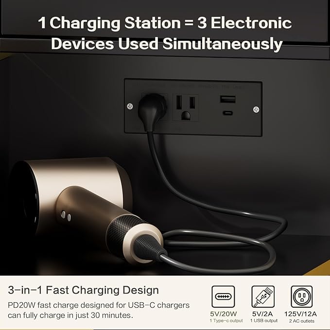 - 【Built-in Power Strip】Upgrade design!This makeup table equipped with a power strip that has 2 standard plug sockets ,1 USB ports and 1 T-C with a 4.9-foot power cord,convenient for the LED lights,hairdryer, curling iron, and charge your phone, tablet, or other electronics。
