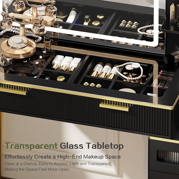 47.24" Big Modern Vanity Desk with Mirror and Lights,Makeup Vanity Desk with 5 Drawers and Storage Shelves & Power Outlet,Dressing Table with Glass Top, Black