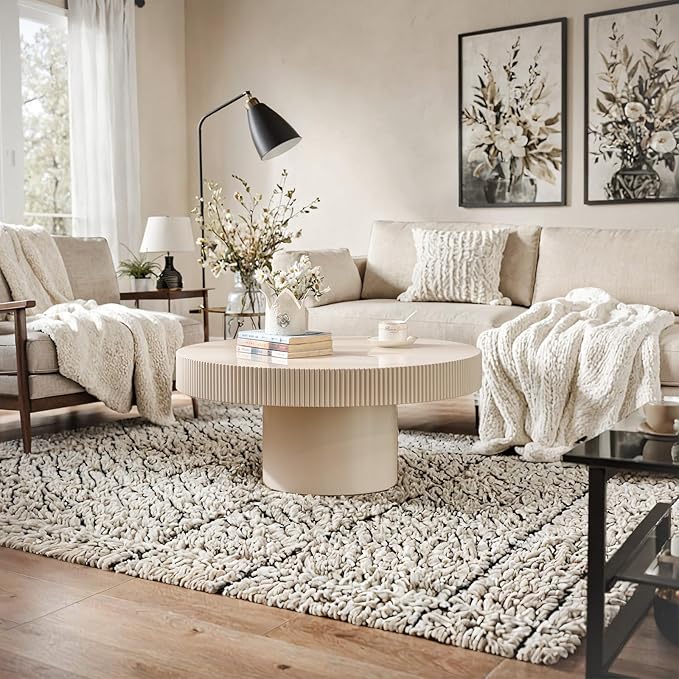 30.71" Round Drum Coffee Tables Modern Handcraft Drum Coffee Table Circle Coffee Table with Sturdy Pedestal, Fluted Wood Coffee Tables Accent End Table for Living Room Apartment,White