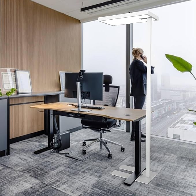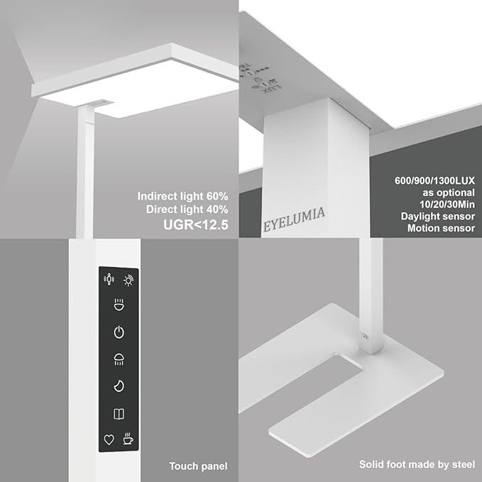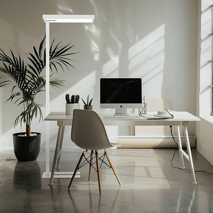 - Super Bright Floor Lamp: Eyelumia floor lamp is equipped with an oversized head (41cm*62cm) and a top and bottom light-emitting design, with a lumen value of up to 10,800LM, which reflects the light from the ceiling and provides an even overall light environment. Its powerful light output covers a wide area and illuminates up to 172 square feet, making it the perfect natural light office floor lamp for living rooms, dens, offices, piano rooms, and workplaces.