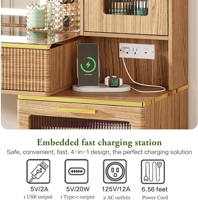 - 【Built-in Power Strip】Upgrade design!This makeup table equipped with a power strip that has 2 standard plug sockets ,1 USB ports and 1 T-C with a 4.9-foot power cord,convenient for the LED lights,hairdryer, curling iron, and charge your phone, tablet, or other electronics。