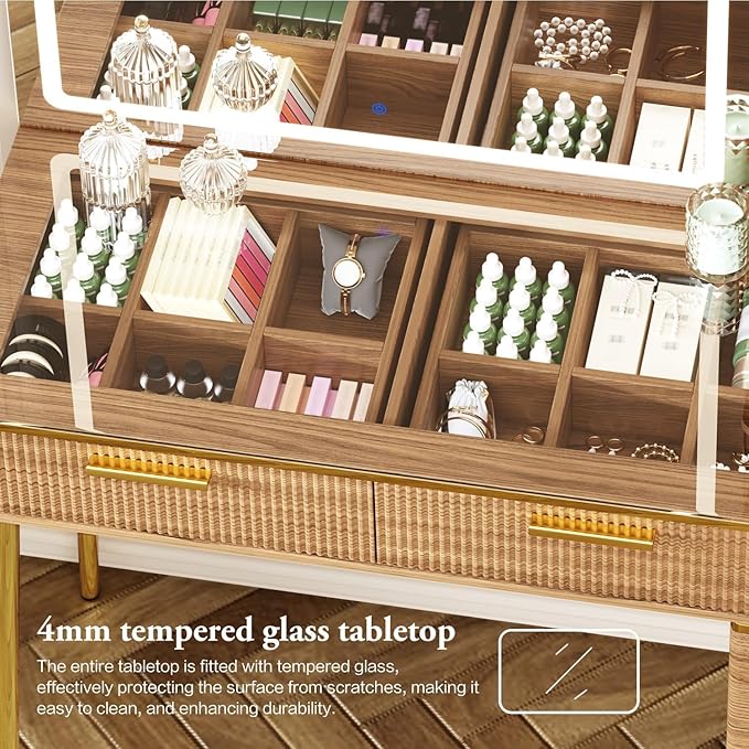 - 【3-Color LED Light】The vanity desk features a specially shaped dimmable lighting mirror with 3 different LED lighting colors, including natural, warm and cool light, for a variety of indoor lighting and environments to optimize your makeup