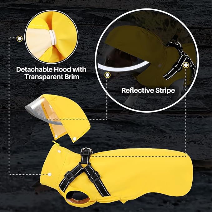 - 【Adjustable & Easy to Wear】Rain jacket for dogs waterproof, designed with a zipper and adjustable elastic band, a detachable hood and a harness with adjustable buckles, allowing you to easily adjust to the right size for your dog. For its chic look, it can also be a cute everyday wear for your dog.