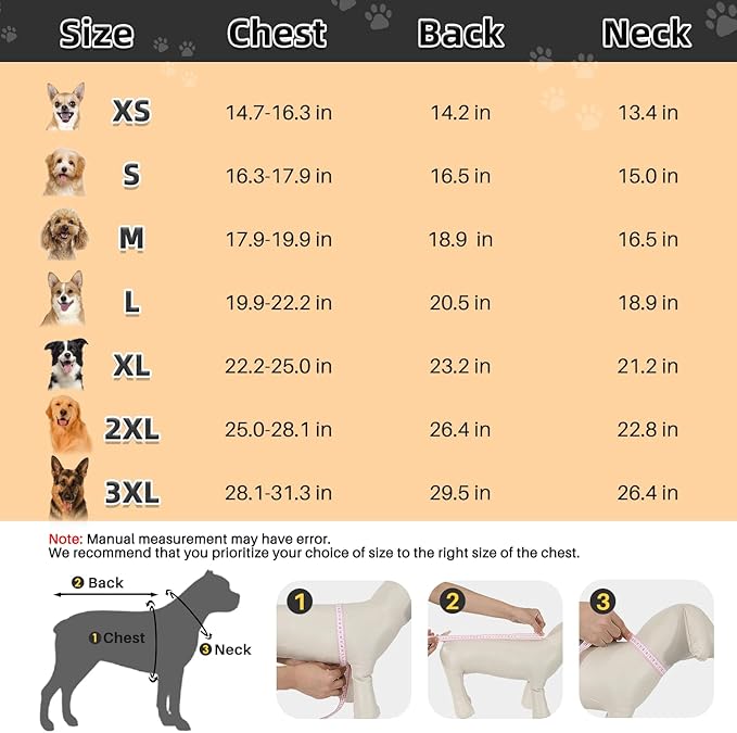 - 【HOW TO CHOOSE A SIZE?】 -- Measure the dog's chest girth (Priority), back length and neck circumference, and then refer to the size chart for selection. If your dog has a large body size or chest, it is recommended to choose one size larger. Suitable for XS, S, M, L, XL,XXL,XXXL dogs.