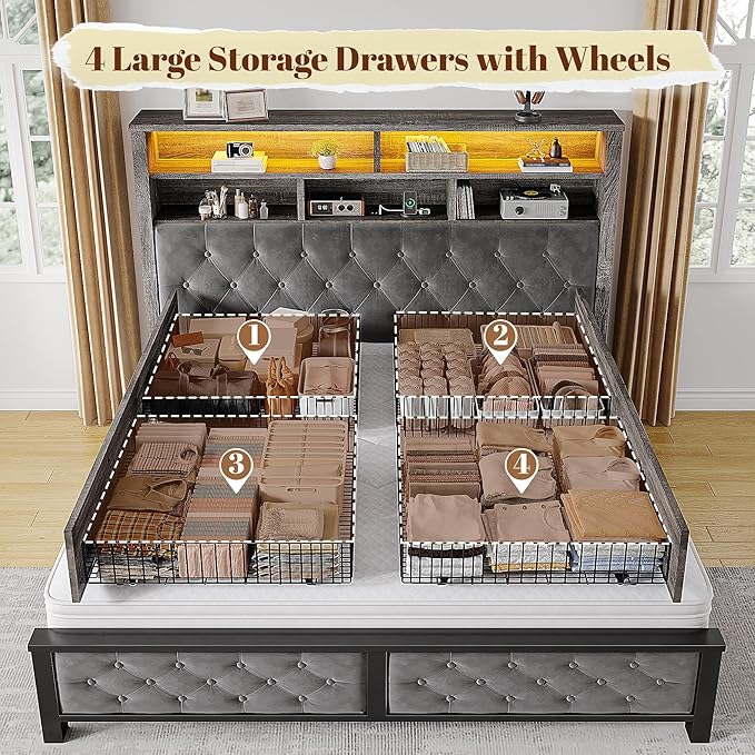EnHomee Queen Bed Frame with Storage Headboard & 4 Drawers,Wooden Bed Frame Queen Size with Charging Station & LED Lights Upholstered,NO Noise,No Box Spring Needed,Gray