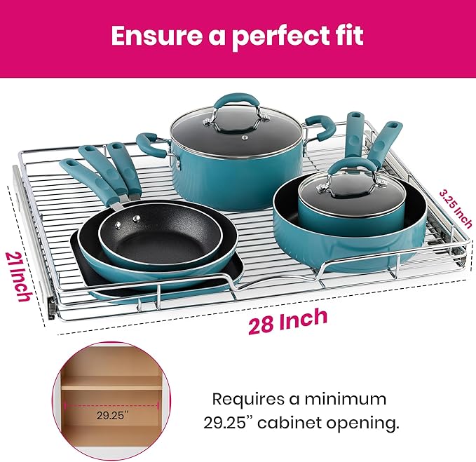 - EASY TO INSTALL & HARDWARE INCLUDED: Our pull out cabinet organizer dimensions measure 28”W x 21”D x 3.15” and includes simple step-by-step instructions along with all of the hardware necessary for easy installation. Installs with just a few simple screws, and Fits cabinet openings 29-1/4”and larger.