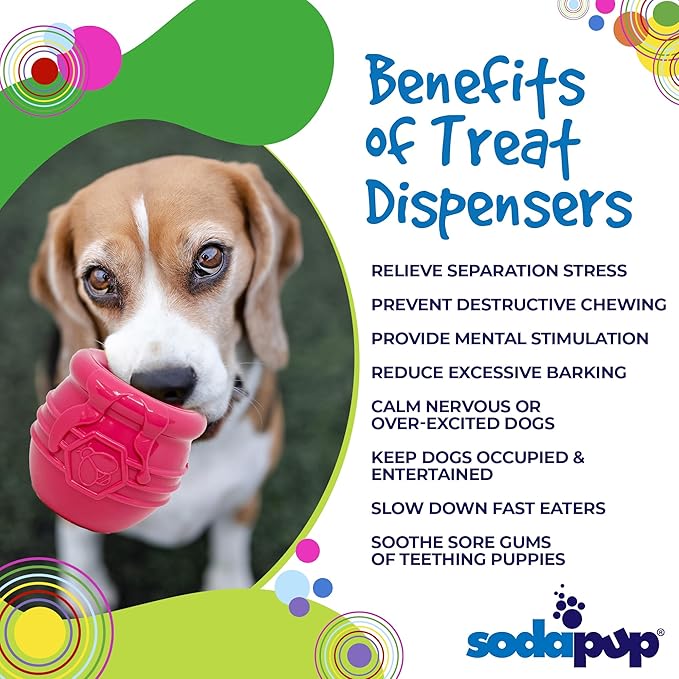 - BENEFITS OF TREAT DISPENSERS – Relieve separation stress, reduce problem chewing, provide mental stimulation, reduce excessive barking, calm nervous & over-excited dogs, keeps dogs occupied, slow down fast eaters, and soothe gums of teething puppies.