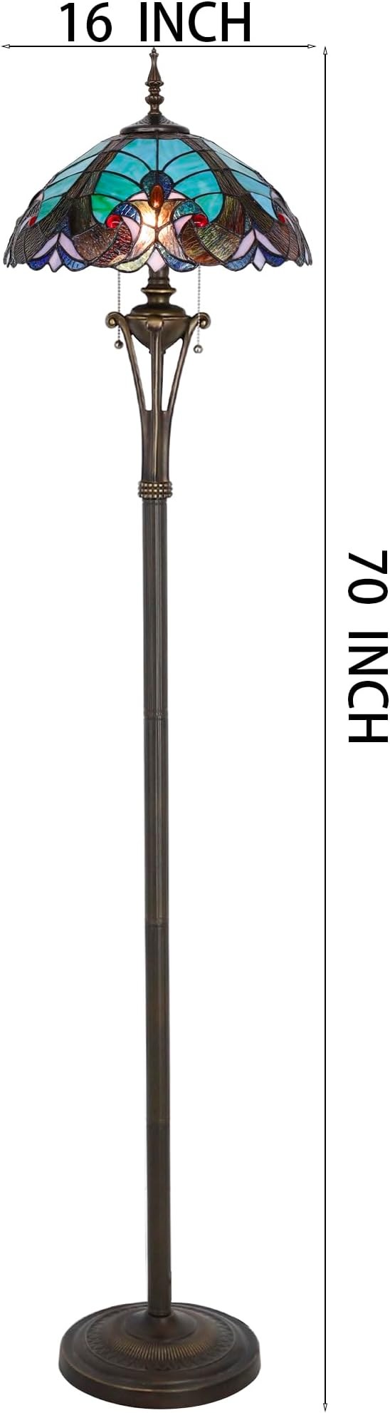 - Design: The lampshade wide 16 inch, the floor lamp height 70 inch. The metal base bronze finished wide 11 Inch, provide a good stability from falling, Pull chain switch, UL listed.