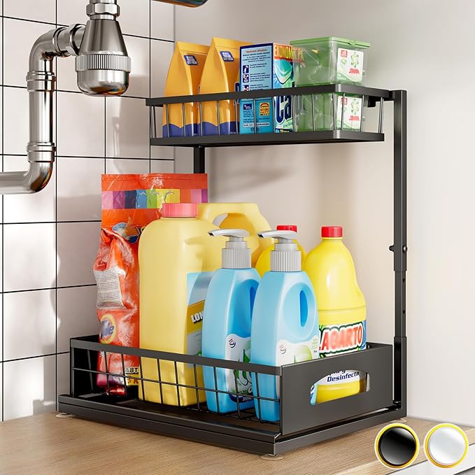- SECURE & STURDY DESIGN: The lower drawer's high basket fence keeps items secure. Made with thicker metal wires, reinforced with metal plates, and coated in a rust-proof baking paint finish, this under sink organizer prevents bending, resists deformation, and ensures long-lasting durability and stability.
