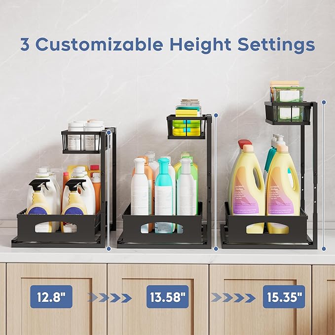 Under Sink Organizer and Storage, Height Adjustable Cabinet Organizer with Slide Out Drawer, Pull Out Under Sink Storage, Multi-Purpose 2 Tier Sink Shelves for Kitchen Bathroom Pantry (Black, 1 Pack)