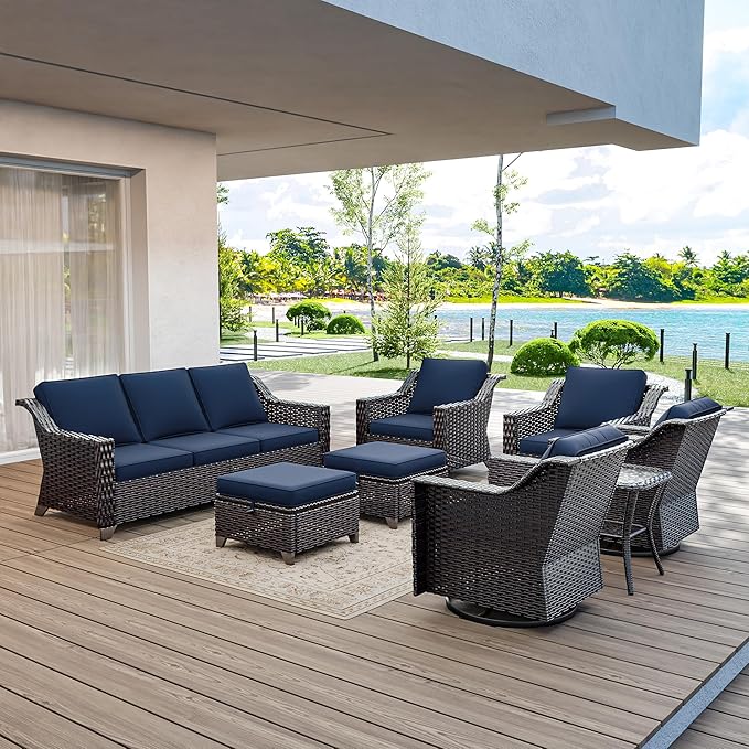 8 Pieces Wicker Patio Furniture, Luxury Outdoor Furniture with 2 Patio Swivel Chair, 2 Patio Chair, 3-Seater Sofa, 2 Patio Ottoman and 1 Side Table, Wide Armrest, Thickened Cushions