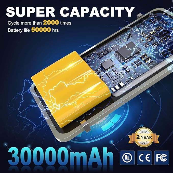 - [High Efficiency Solar Outdoor Lights]: Made with high-quality ABS and a die-cast aluminum frame, our 6000W solar powered outdoor lights are durable and IP66 waterproof. The 6V/40W high-efficiency solar panel converts 25% of solar energy into electricity, powering a 30,000mAh high-capacity battery with stable voltage for your safety