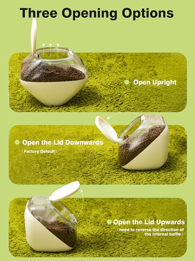 - Three Opening Options: Designed with an internal isolation baffle, our travel cat food storage container uses an anti-gravity principle to prevent spills. You’ll enjoy three convenient opening options, making it suitable for any space in your pantry or kitchen, great for storing pet food.