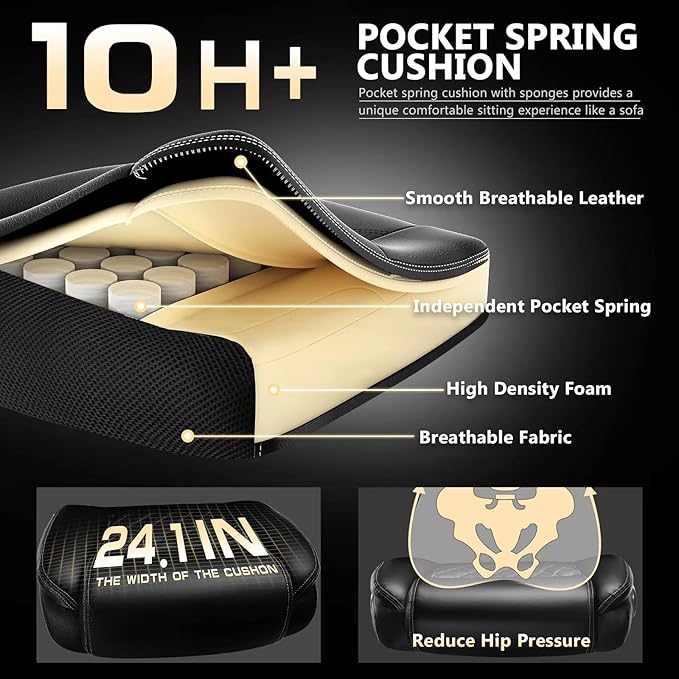 - 👉【Extra Wide Breathable Leather Large Office Chair】:Our executive office chair is equipped with a spring cushion to reduce hip pressure. The extra-wide chair backrest and independent lumbar support gently wraps your body and supports your lower back, thoughtfully designed to keep you comfortable during long hours of working, studying or gaming.