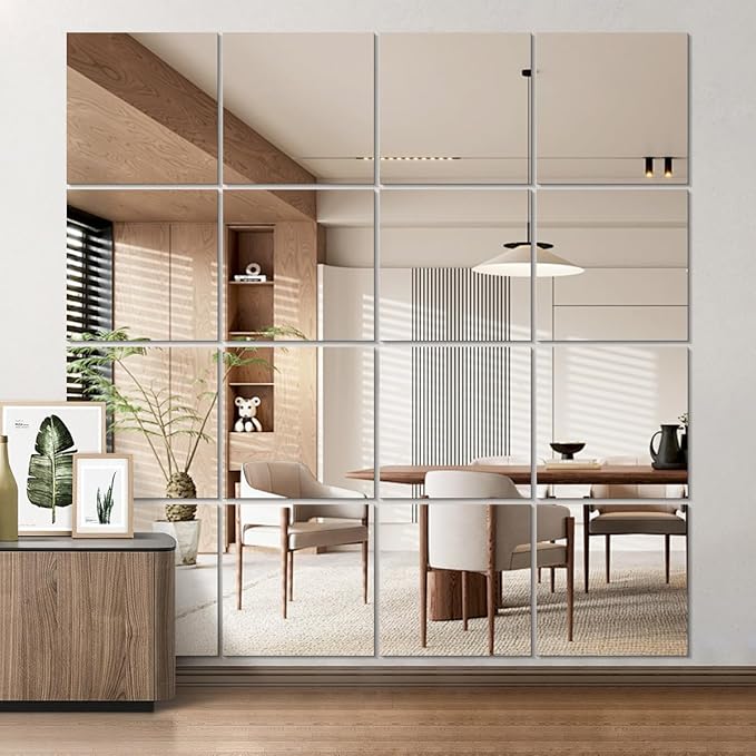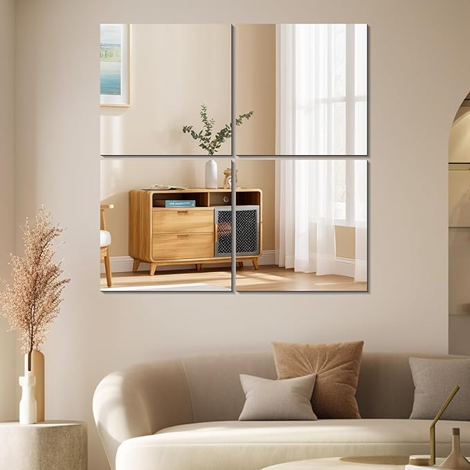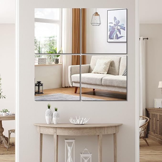 - DIY INSTALLATION - Size: 12'' x 12''. Quantity: 4PCS. There are 4 pieces of mirrors in total, and you can arrange the positions according to your taste. It is a good choice as a full length mirror or as wall mirrors decorative.
