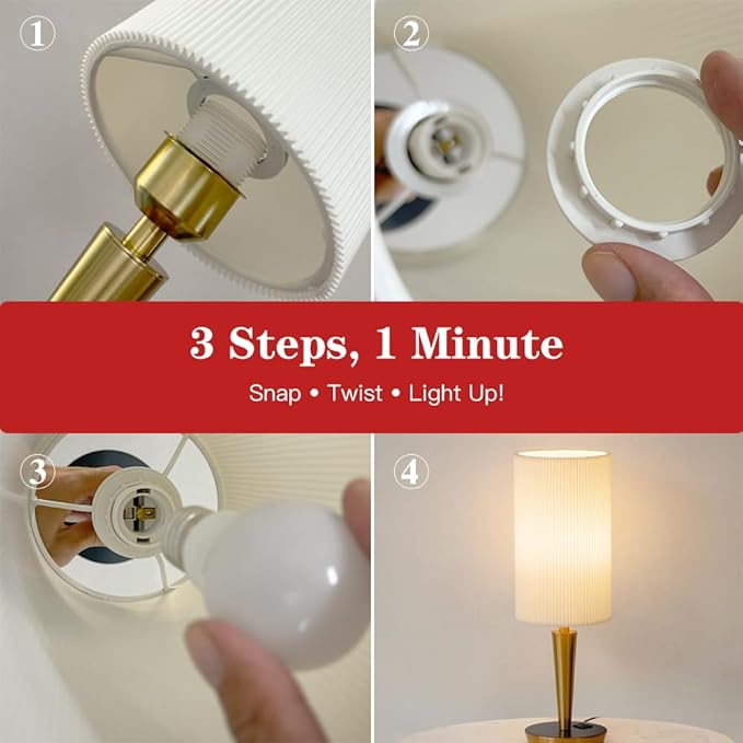 - Bedside Lamp with Charging Station – 3-Step Setup & Shake-Proof Base Install in seconds: 1. Clip the shade → 2. Lock the ring → 3. Screw the bulb. The weighted base stays rock-solid (10+ seconds shake-tested!) for fear-free adjustments.