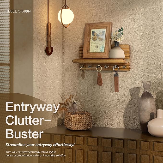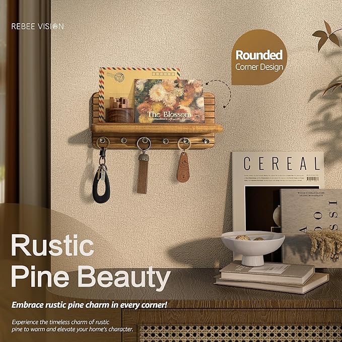 - [SHELF DESIGN] Wondering how to keep your household essentials from taking a tumble? Our wooden shelf features a raised edge to keep everything secure! Display your small plants, daily mail, or cute stuff without worry. This key hooks for wall not only amps up your wall decor living room but also stops those little mishaps that can ruin your day.