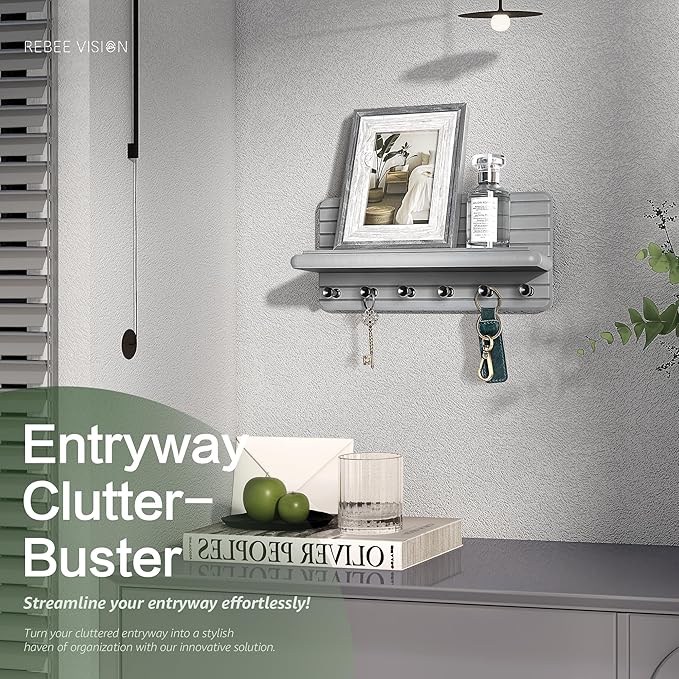 Rebee Vision Decorative Key Holder Wall Mount for Room Decor Aesthetic – Modern 11-inch Pine Wooden Key Holder for Wall with 6 Hooks & Floating Shelf - Sleek Home Improvement Essential (Gray)