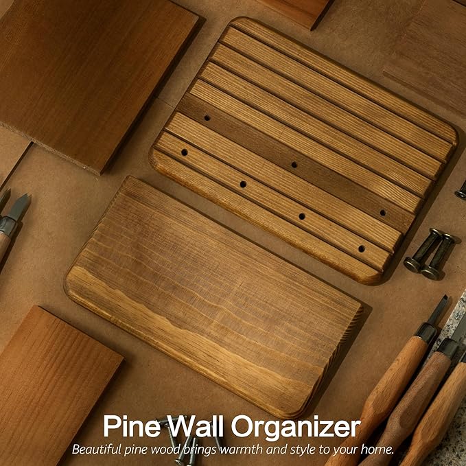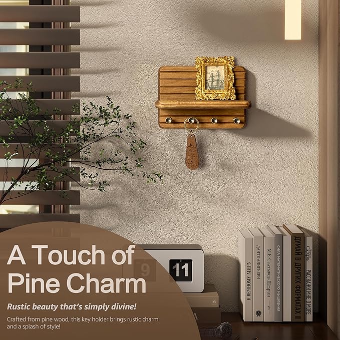 - [SOLID PINE WOOD] Crafted from premium pine wood, this key organizer wall mount offers both strength and charm. The light brown finish adds warmth and a touch of rustic elegance to any room decor aesthetic, making it a great match for farmhouse decor or any house style. Also perfect for everyday use in your home improvement projects.