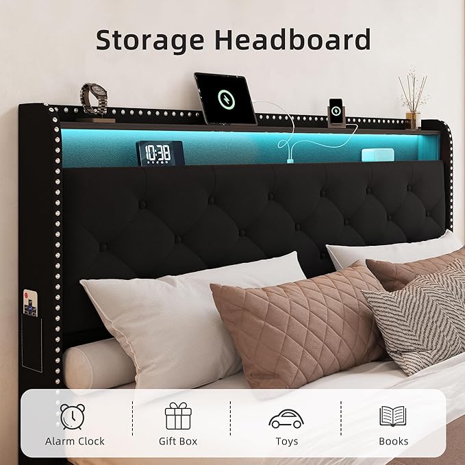 BRELTAM Black Queen Size Bed Frame with LED Light and Charging Station,Upholstered Velvet Tufed Bed Frame with 4 Storaged Drawers Platform Bed Frame with Headboard Heavy Duty Wood Slats, Noise Free