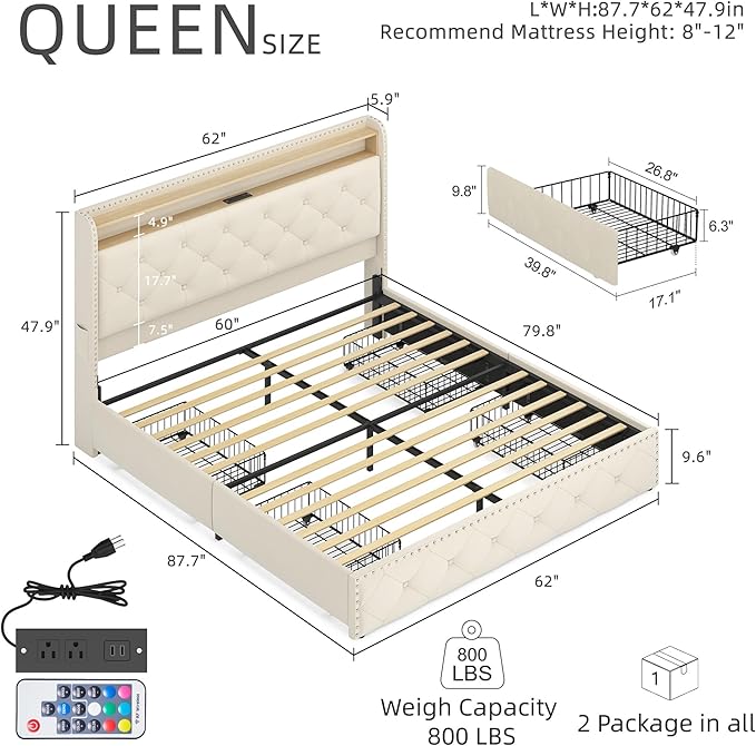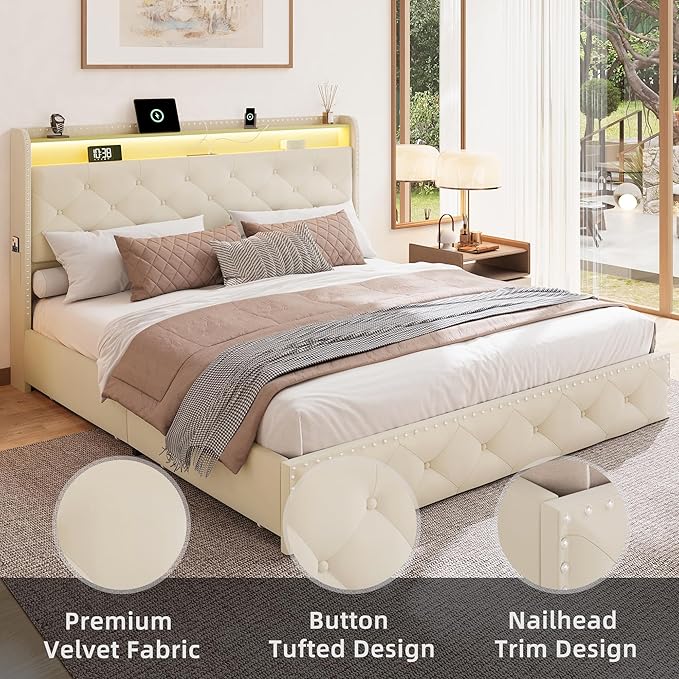 BRELTAM Queen Size Bed Frame with 4 Storage Drawers Platform Bed with Headboard,Upholstered Velve Tufed Bed Frame&LED Light and Charging Station,Heavy Duty Wood Slats,Noise Free,Easy Assembly,Beige