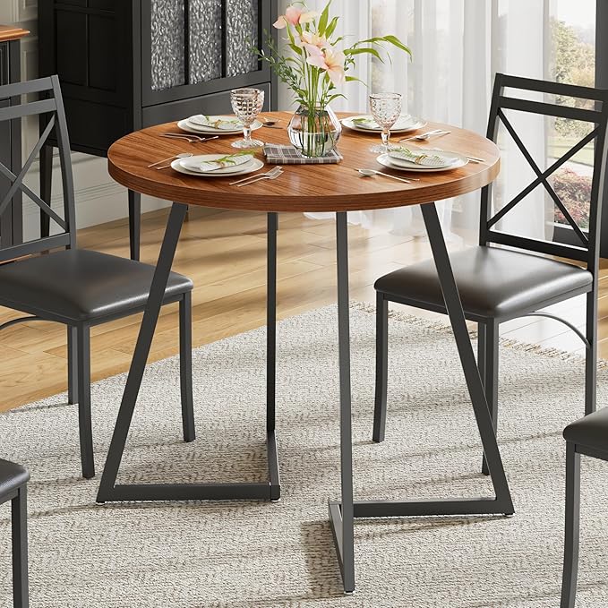 VECELO 35" Round Dining Table for 4, Wood-Grain Tabletop & Heavy-Duty Steel Frame, for Kitchen, Living Room, Easy Assembly, Walnut