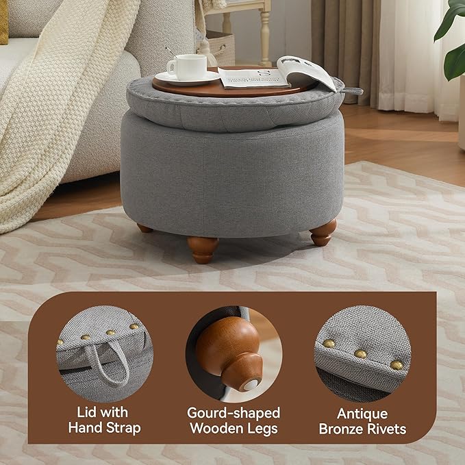 24Inch Round Storage Ottoman with Tray, Modern Tufted Fabric Circle Coffee Table with Storage, Upholstered Ottoman with Removable Top for Living Room, Bedroom, Light Grey