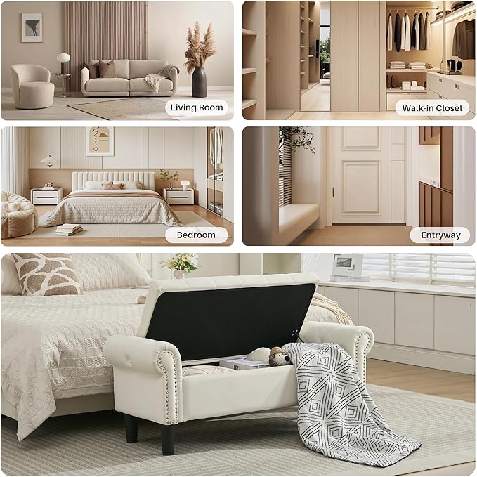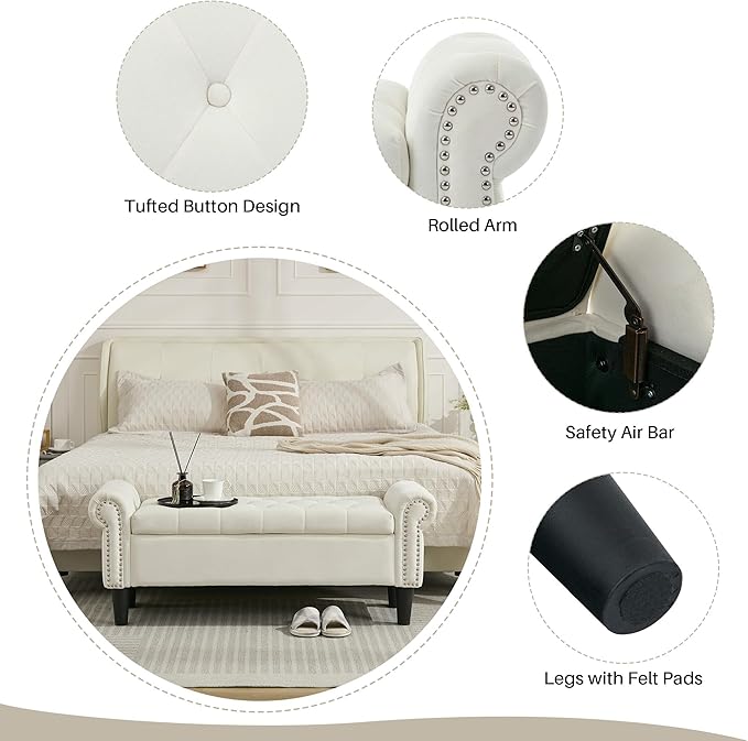 Storage Bench, 50" Queen End of Bed Bench, Velvet Tufted Button Upholstered Bedroom Bench, Storage Ottoman with Rolled Arms, Window Bench with Storage, for Living Room, Entryway Beige