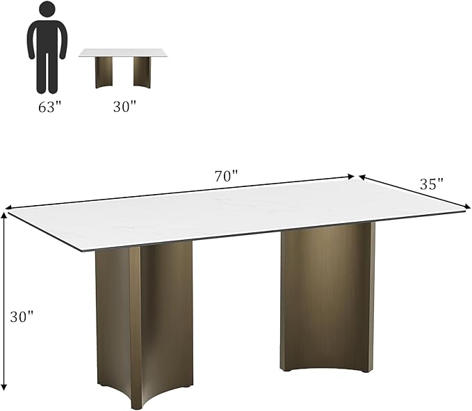 Modern Dining Table for 6, White Sintered Stone Dining Table Top with Brushed Bronze Stainless Steel Base, 70 inch Rectangle Dining Room Table for Home Restaurant (Only Table)