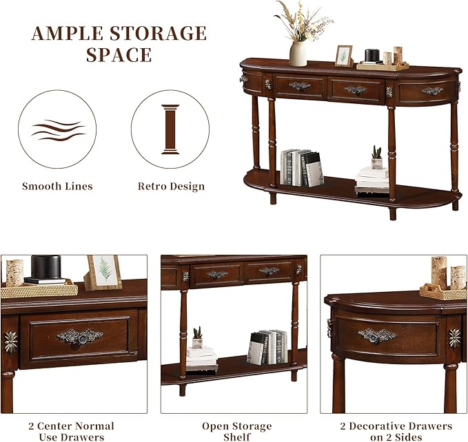 - Easy Assembly: This curved sofa table is very easy to install.Its table top and drawers are pre-assembled,when you receive your package,you just need to assemble 4 legs and 1 bottom shelf to use this console table.If you have any questions,please let us know,we are more than willing to help you.