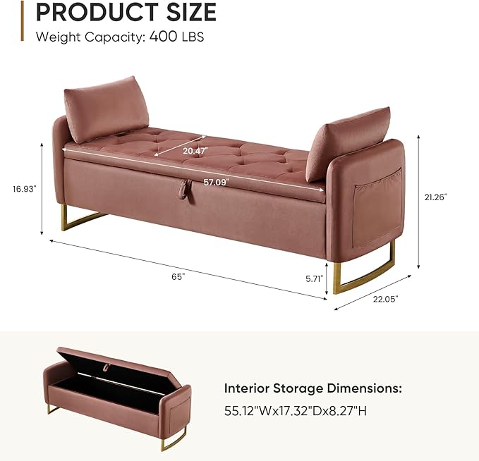 - Large Storage Space - 65 inches storage ottoman bench offers an ample internal space of 55.12" W x 17.32" D x 8.27" H, making it suitable for all bed sizes, particularly FULL and QUEEN sizes. This concealed storage area is perfect for seasonal blankets, toys, pillows, cushions, and more. Additionally, extra pockets on the side of the armrest provide convenient storage for books and magazines—helping you organize your room efficiently.