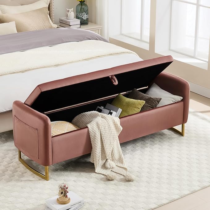 - Comfortable Material - Upholstered in 100% velvet polyester fabric, this cushioned bedroom bench with storage is soft to the touch and skin-friendly. The high-density foam cushion ensures a supremely comfortable seating experience that maintains its shape over time. Two additional pillows are included for enhanced reading and relaxation comfort.