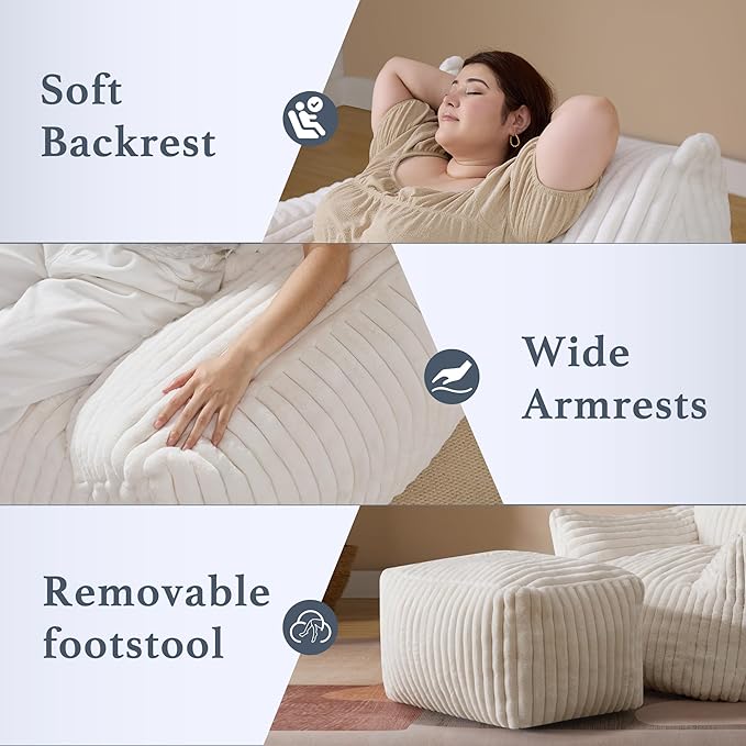 Oversized Bean Bag Chaise Lounge Chair Indoor for Adults with Armrests & Ottoman - Giant Comfy Beige Beanbag Lazy Floor Sofa Cloud Accent Chair for Reading, Gaming, Cozy Fluffy Cloud Mini Couch