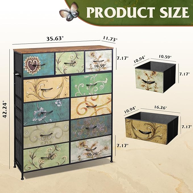 WLIVE Storage Organizer Unit with 11 Fabric Bins, Storage Drawers Organizer with Steel Frame, Tall Storage Tower Organizaton for Living Room, Hallway, Office, Floral Painted